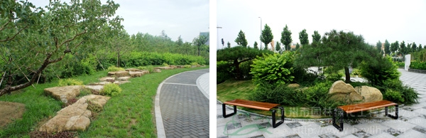 此外,工程中還用到了很多的景觀石,據高經理介紹,這些產自山東的龜紋石,質地堅硬,表面紋路獨特,主要用于上、下層苗木之間的過渡,相鄰景觀節點的分隔處,以及草坪中的點綴等。這些看似隨意但卻自然、和諧的景石擺放,讓生活在都市里的人們感受到了山之秀美、林之繁茂,就像一首無言的詩,一幅立體的畫,和著自然的旋律“輕歌曼舞”。