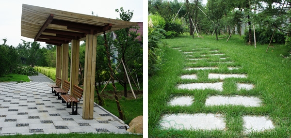 而在道路十字路口的節點處,則主要是用10cm×10cm的小花崗巖鋪地,鋪出來的路面整潔、平坦,看似簡單,實則對施工技術要求相當高。草坪中的地面鋪裝,則采用花崗巖汀步,用錯縫鋪裝法,兩塊花崗巖之間用草皮鑲嵌,就像給每塊花崗巖鑲了一道綠邊,與旁邊的草坪和諧地融為一體。貫穿整個工程的游憩步道,全部采用“人字形”的鋪裝方法,中間用透水磚、兩邊以花崗巖鑲邊,透水磚價格不高,用以鑲邊的花崗巖是利用了鋪裝中剩余的邊料,雖然用料簡單,但通過對技術的嚴格要求,鋪出的路面卻整潔而不失韻味,是一種實用、環保、節約的做法。