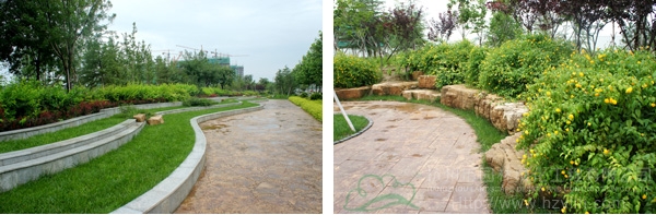 為了配合每個景觀節點的風格,園路的鋪裝材料和手法各不相同。據高經理介紹,工程中用到的鋪裝材料主要有汀布石、印花地坪、文化石、青磚、荷蘭磚、花崗巖等,其中,印花地坪是一種新型的鋪裝材料?!坝』ǖ仄褐饕迷诒睆V場上,其工藝為:在混凝土上面灑上特殊的配料,整平之后,再用模具一塊一塊壓出形狀,最后用特殊的膠水封膜,這種施工方法工藝新穎,花樣和顏色比較多,雖然工藝較為復雜,但是景觀效果非常好,遠遠看去,就如盛開在腳下的‘花?!?,一路迤邐而去?!备呓浝碚f,“其他的鋪裝材料雖然比較常見,但我們在鋪裝工藝上進行了創新,如在下沉廣場的廊架旁,我們用黑色的鵝卵石與芝麻灰的花崗巖搭配,鋪出來的路面呈現出立體感,這種鋪裝工藝是借鑒了室內裝飾的手法,通過改造,用于室外鋪裝,遠遠看去,就像一級一級的臺階,帶動了周圍的景觀也動起來?!?/p>