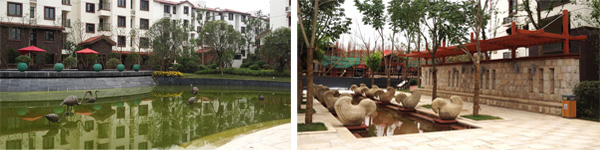 在紫荊東郡小區,水景隨處可見,從主入口兩側近50米的景觀橋水景,到入口正前方一個大型的石雕噴泉,再到小區里面幾條主干道交匯的十字路口的小型地面噴泉,中心水景上的圓形石雕噴泉,特別是不遠處的動物噴泉雕塑,只只鶴低頭凝思,細長的水流從鼻端的出水口處流出,落入下方的水池里,更是格外引人注目。"這些水景小品具有的藝術特性與審美效果,加強了整個景觀環境的藝術氛圍,成為讓空間環境生動起來的關鍵因素,在提高小區藝術品質和景觀形象的同時,更給人們帶來美的享受。"楊經理如是說。