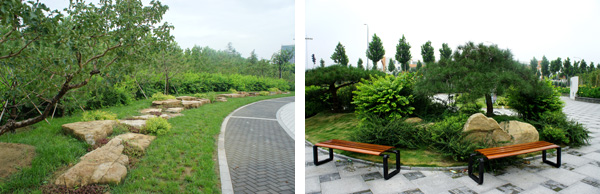 而在道路十字路口的節點處,則主要是用10cm×10cm的小花崗巖鋪地,鋪出來的路面整潔、平坦,看似簡單,實則對施工技術要求相當高。草坪中的地面鋪裝,則采用花崗巖汀步,用錯縫鋪裝法,兩塊花崗巖之間用草皮鑲嵌,就像給每塊花崗巖鑲了一道綠邊,與旁邊的草坪和諧地融為一體。貫穿整個工程的游憩步道,全部采用"人字形"的鋪裝方法,中間用透水磚、兩邊以花崗巖鑲邊,透水磚價格不高,用以鑲邊的花崗巖是利用了鋪裝中剩余的邊料,雖然用料簡單,但通過對技術的嚴格要求,鋪出的路面卻整潔而不失韻味,是一種實用、環保、節約的做法。