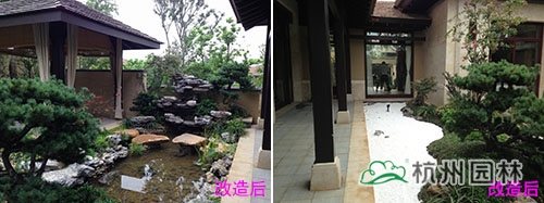 下沉庭院原有景觀過于生硬,空間分界感不強,改造后用木柵欄進行明確分隔,拆除原有部分鋪裝,以竹子為背景,堆土成坡,種植造型羅漢松,使得此處的景觀猶如微型盆景放大后的效果,讓人眼前一亮。