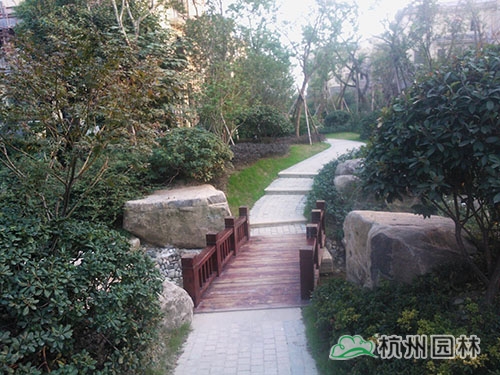 在施工中,項目部堅持遵循仿生原則、植物多樣性原則、景觀多樣性原則、適地適樹原則的綜合運用,打造出了令人滿意的景觀效果。整個小區內植物主次分明,高低錯落,張馳有序,除了公共景區綠化,其他部分劃成一個個區域,根據不同的結構特點,進行植物配置,如在沿居住區蜿蜒而行的小溪邊,櫸樹連排種植,效果非常突出,與其他植物一起,營造出“小橋流水人家”的意境,極大地豐富了水景,讓人有一種回歸自然、悠然自得的感覺,為小區里的住戶提供了一個綠色、環保、優美的居住環境,得到了業主方的高度贊譽。