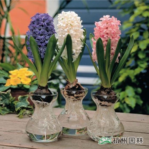 風信子:目前市場上常見的風信子有粉、藍、玫紅、紫、白等品種,其中以藍、粉、紫最受歡迎。選購時要挑個頭大而飽滿的,抓在手上硬實偏重,根部不發霉,生長點未受破壞的種球。11月下旬種植,在陰冷的環境下放置兩個月左右,這樣處理可以減少后期夾箭的概率,也有利于根系的生長,待花芽長至5cm左右時移至光線充足的區域即可。風信子也可水培,但較盆栽一般花箭短、花朵少,花期也會短一周左右。