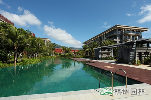 項目位于海南省三亞市亞龍灣椰風路南部,整體景觀顯得張弛有度,開闊大氣的廣場鋪裝、宛若綠色地毯般的草坪、色彩豐富長勢茂盛的植物、藍寶石般的碧藍泳池……規整中不失自然,簡潔中深藏精致,盡顯現代主義風情的園林美景。