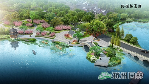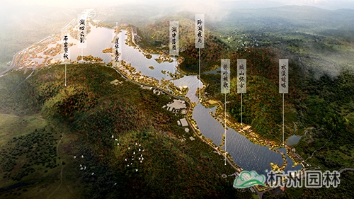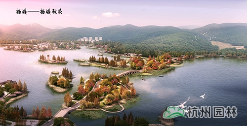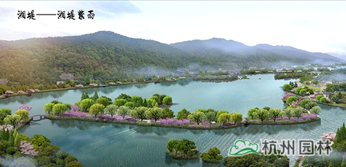 依據湘湖內部自北向南的五堤,各堤路賦以色相植物,打造湘堤紫雨、越堤紅梅、楊堤秋染、長堤金風、賀堤碧玉。