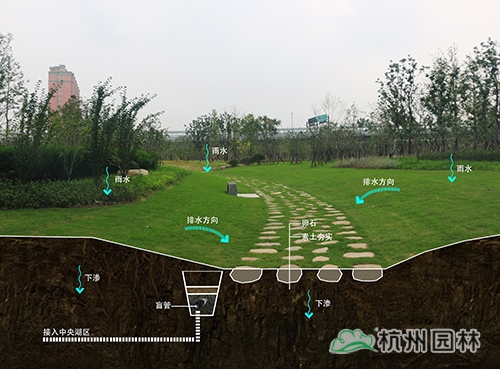 利用公園的自身條件優勢,打造雨水花園,將地表徑流匯流至公園景觀水系,將雨水儲存在水系中。當水位高于溢流口時,可將水排放至市政管網。必要時可在水系中設置抽水泵,將水用于澆灌養護園林植物。