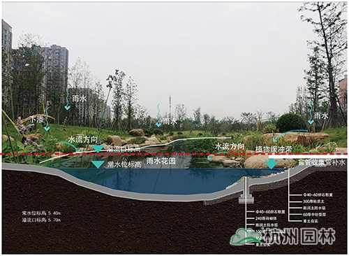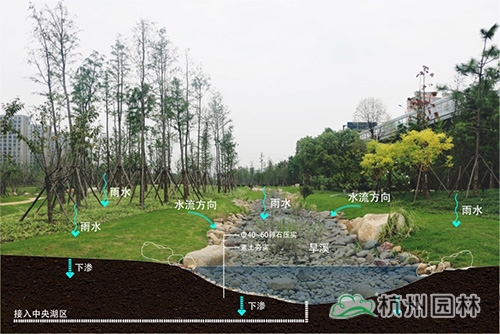 旱溪布置于帶狀綠地低洼處。設計時仿造自然界中干涸的河床,配合濕生植物的營造,在意境上表達出溪水的景觀。降雨時可減緩地表徑流,起到緩排作用。旱溪底部接盲管,將水導入中央湖區,進行儲存。