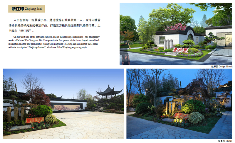 位于浙江園主入口西側的景觀小品“浙江印”,提煉自石鼓篆書第一人、西泠印社首任社長吳昌碩先生的書法作品,三方極具浙派篆刻風格的印章上,“浙江園”三個字,干凈、利落,古樸、大氣。這幅美景的背后,是深化設計團隊數次往返西泠印社,從無數的篆刻名家作品中挑選、比對,決定采用最能代表浙江篆刻藝術的吳昌碩先生字體,從中找出“浙”、“江”、“園”三個字,在設計圖中反復比對,調整位置、大小,最終確定下來。