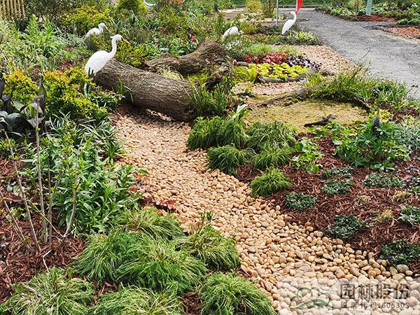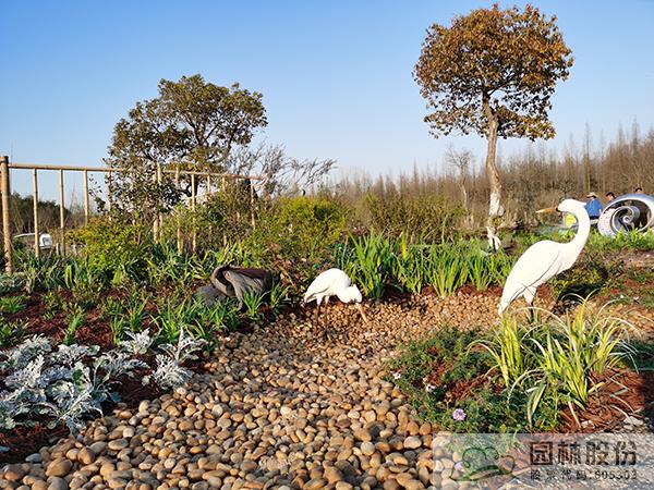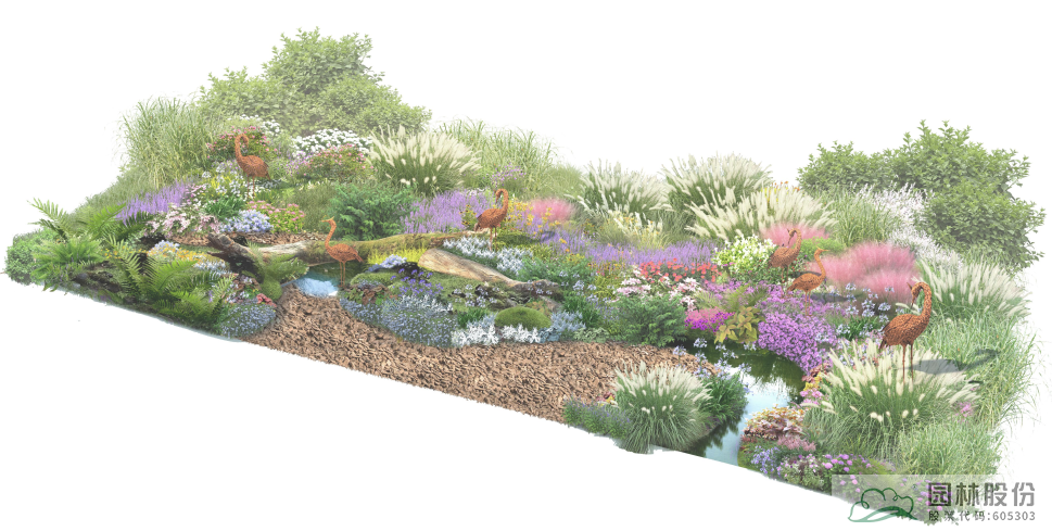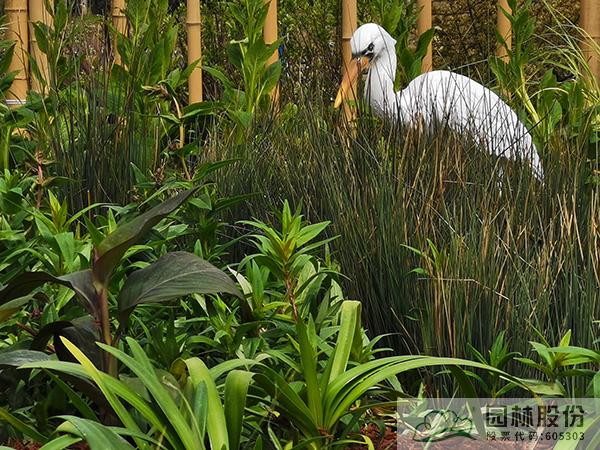 “澤·頌”花境景觀選取了濕地中三種類型,分別以木本花境、觀賞草混搭宿根植物、枯木苔蘚三種植物景觀模式,模擬自然濕地的灌叢、草甸、蘚類三種不同類別濕地景觀,通過豐富的花境植物材料及水鳥造型、枯木等的應用,表現近幾年來建設新時代美麗杭州、打造“濕地水城”、提升生態人文景觀建設過程中取得的成果。