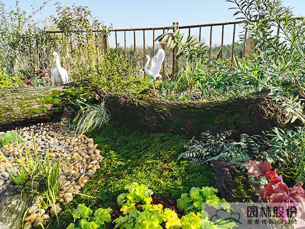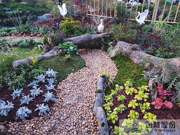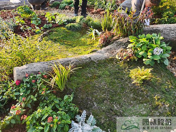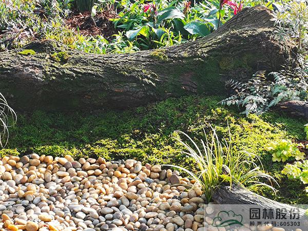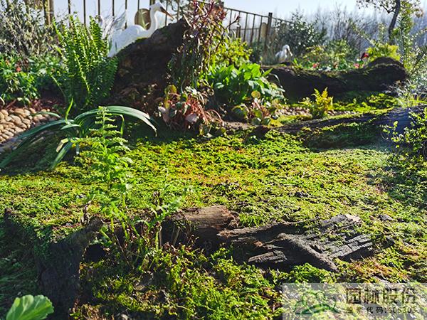 ①模擬苔蘚植物的生境條件,將蘚類濕地景觀與枯木結合,在枯木與卵石道路交叉部位布設小水塘,保持苔蘚生長環境土壤濕度。
