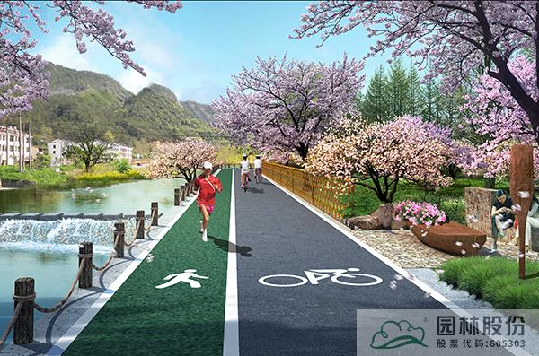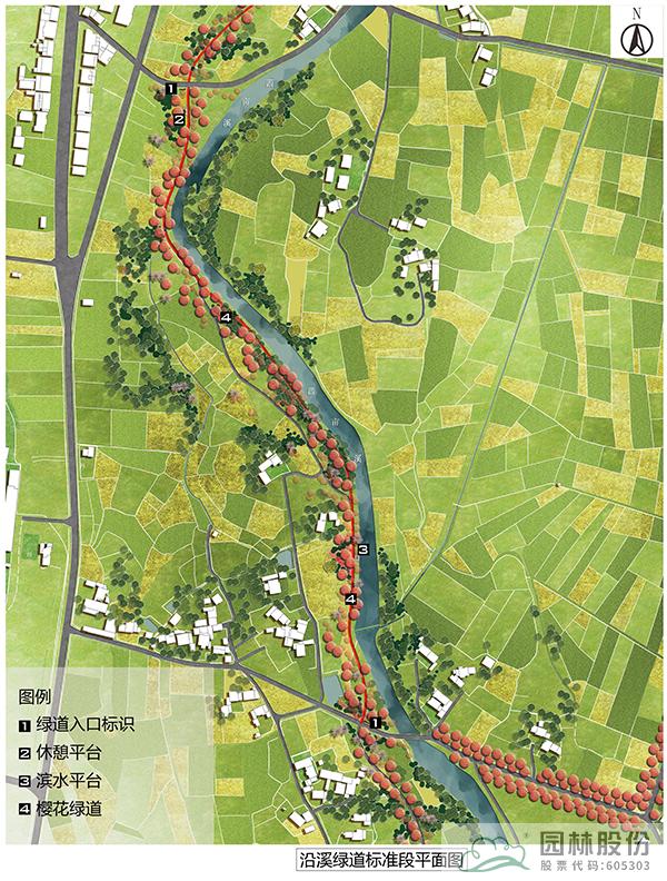 沿溪綠道為櫻花環中濱河段落,該標準段長度為730m,總長2590m。以春季櫻花為主題,打造浪漫的濱水慢行系統,沿線打造休憩空間,設置休憩設施,并在入口處設計特色標識,成為村民通行休閑健身的浪漫步道。