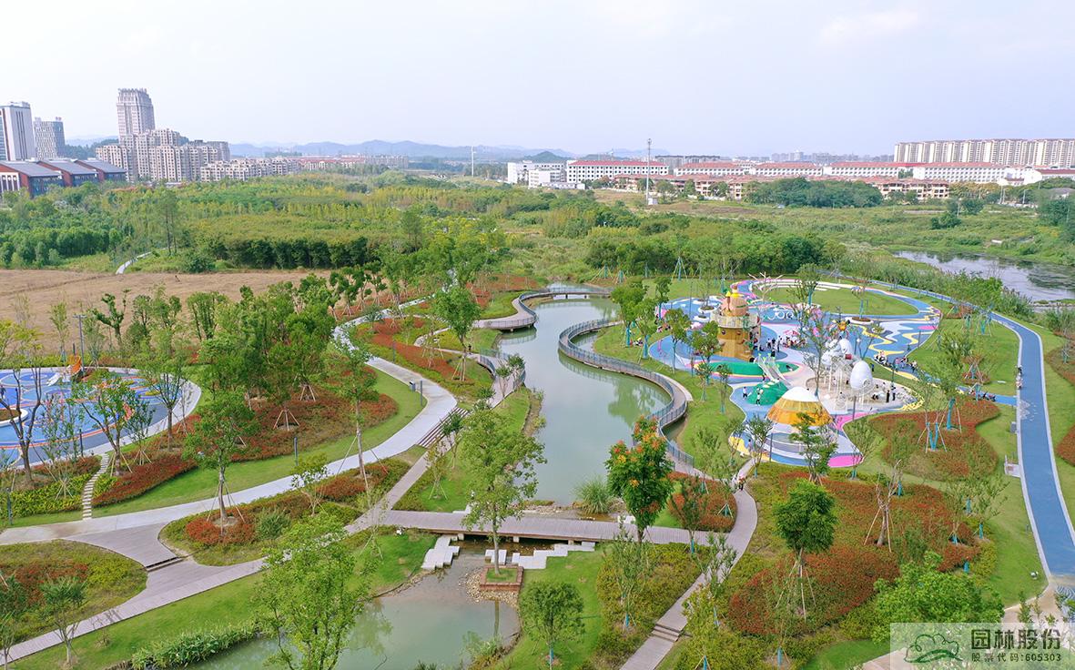 項目利用中心湖蜿蜒的湖灣和眾多洼地,引水入園,形成沿湖而生的各個景點。湖區背山面水,視線開闊,能遠望城市。沿線眾多湖灣處,設置各色景觀橋連通內塘與外湖的生態通道,同時景觀建筑依水而建,與周邊景色相映成趣。