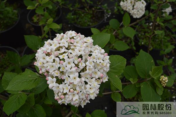忍冬科莢蒾屬,半常綠或常綠灌木,株高2-3 m,為紅蕾莢蒾和煙管莢蒾的雜交種。葉色深綠,秋季轉紅,顏色程度因所處地區而異。該種繼承了紅蕾莢蒾粉花的優良基因,花序未開放時呈現靚麗的粉色,開放后白色,且具有較濃郁的花香。花徑一般4.5-10 cm,花期3-4月。植株具有良好的頂端優勢,枝條年生長量大,但分枝能力稍弱。幾乎無病蟲害。適應性強,生長速度快,耐干旱且耐寒,適合自然風格的工程應用或庭院觀賞。